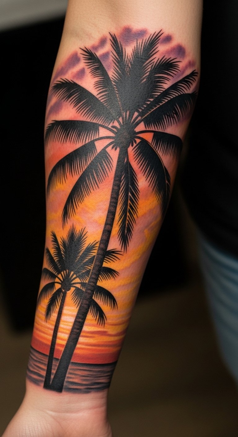This tattoo symbolizes a deep connection to Puerto Rican roots, representing the island’s rich culture and natural beauty. The palm trees evoke a sense of freedom and warmth, while the sunset serves as a reminder of the vibrant life and experiences tied to the island.