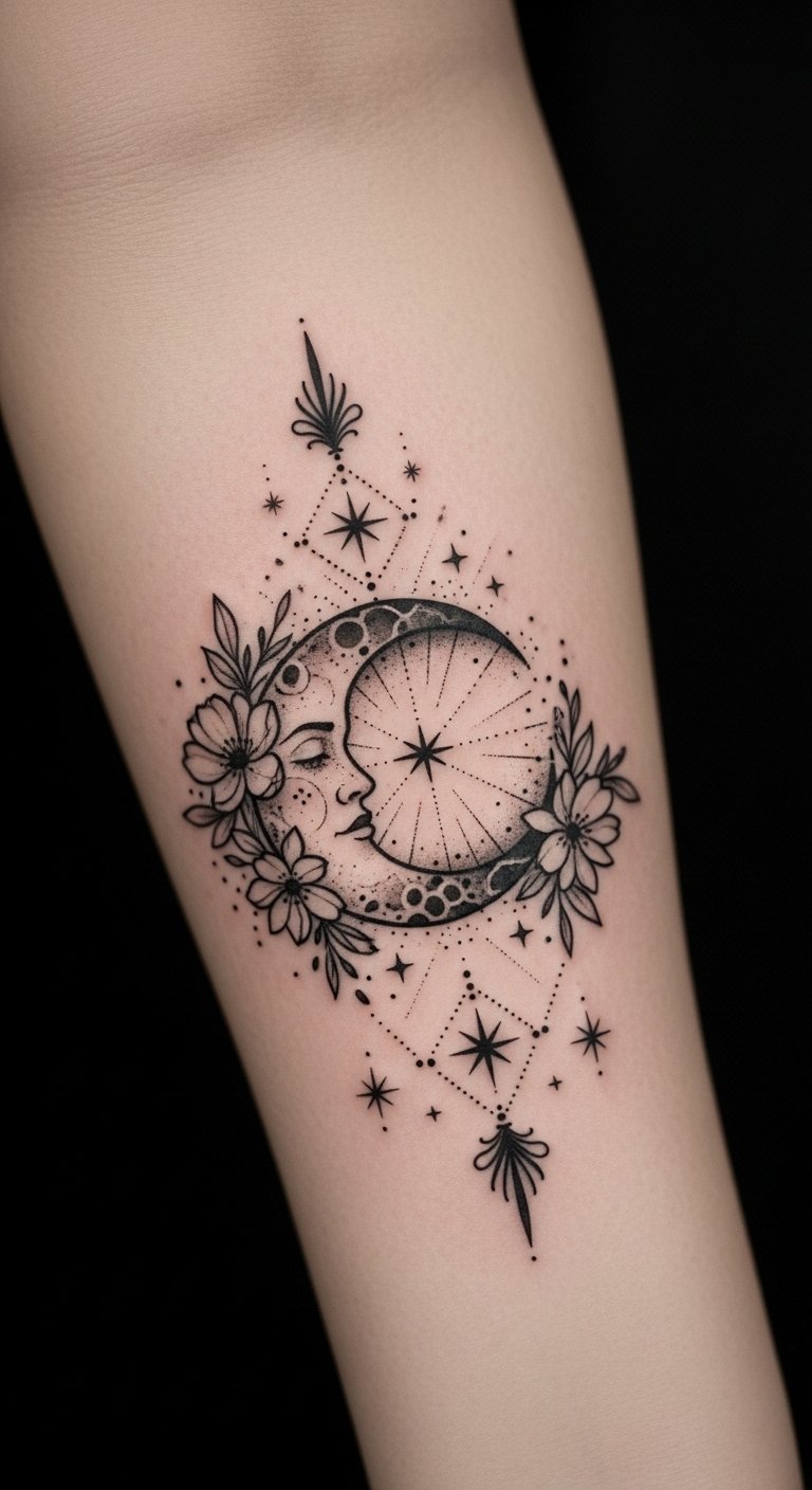 Positioned on the forearm, it serves as a constant reminder to trust one’s instincts and embrace transformation. The crescent moon reflects the mysteries of the unconscious, while the surrounding stars and flowers add an element of magic and growth.