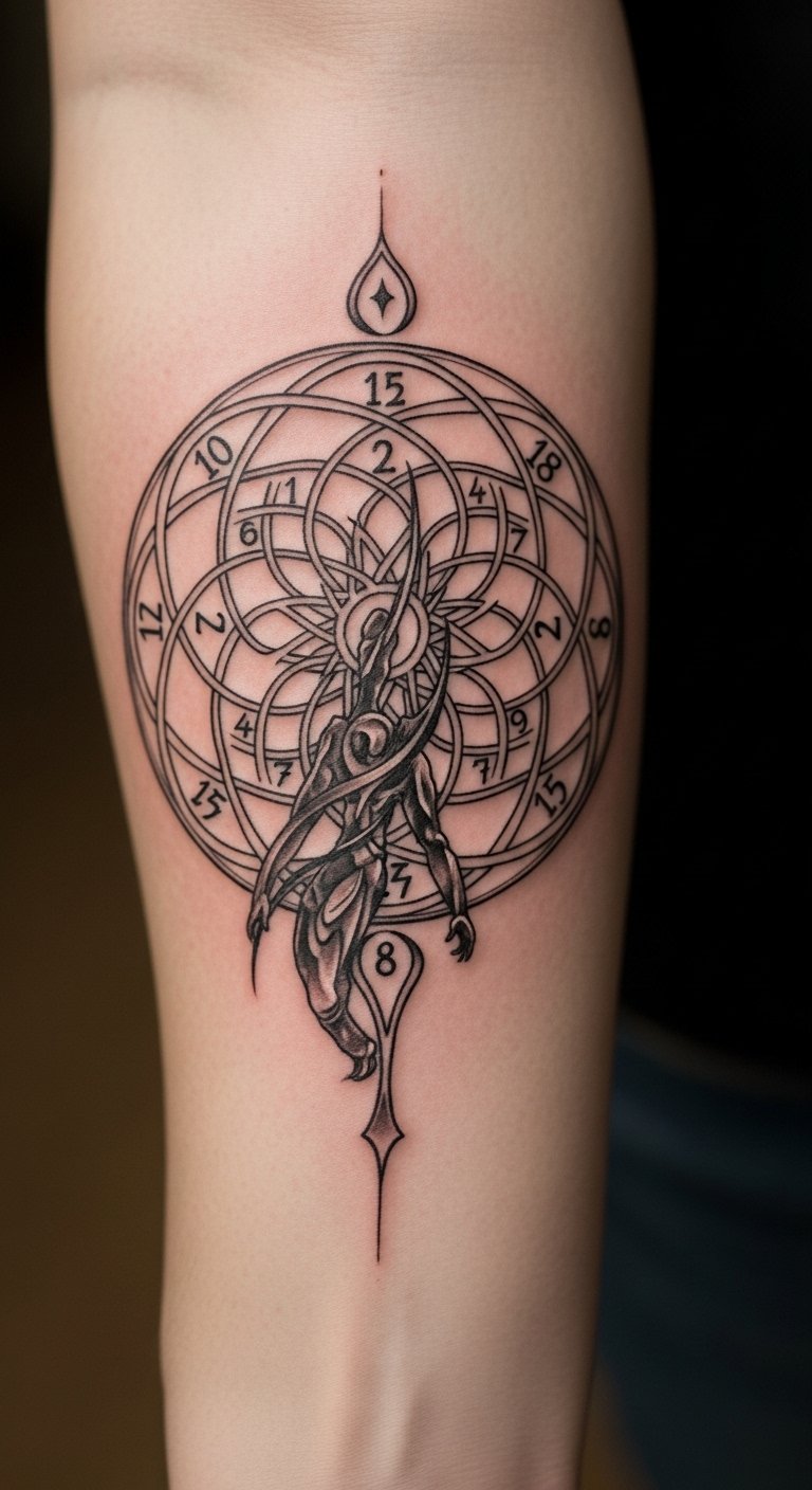 This tattoo embodies the journey of personal growth and transformation, with the circle symbolizing wholeness and continuity, while the numbers may represent significant milestones or dates in one’s life.