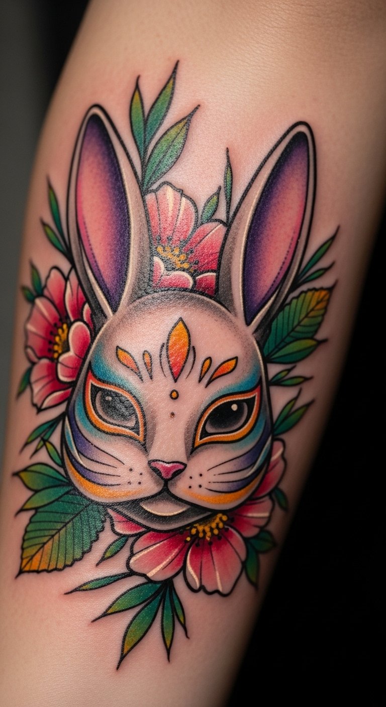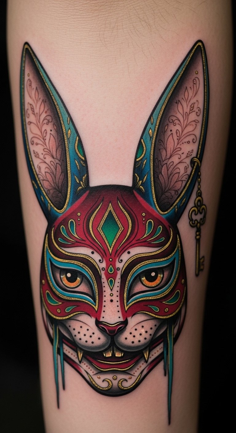 Positioned on the forearm, it allows for visibility and expression, making it an ideal canvas for showcasing one’s unique style and connection to the symbolism of the bunny mask.