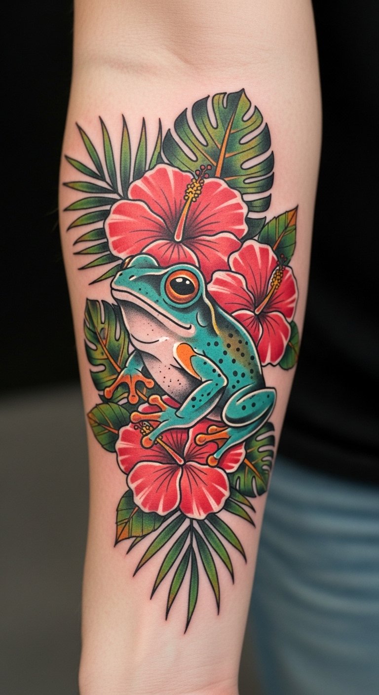 The coquí frog represents resilience and the beauty of Puerto Rican heritage, while the tropical flowers symbolize growth and vibrancy, making the tattoo not just an art piece but a personal narrative.
