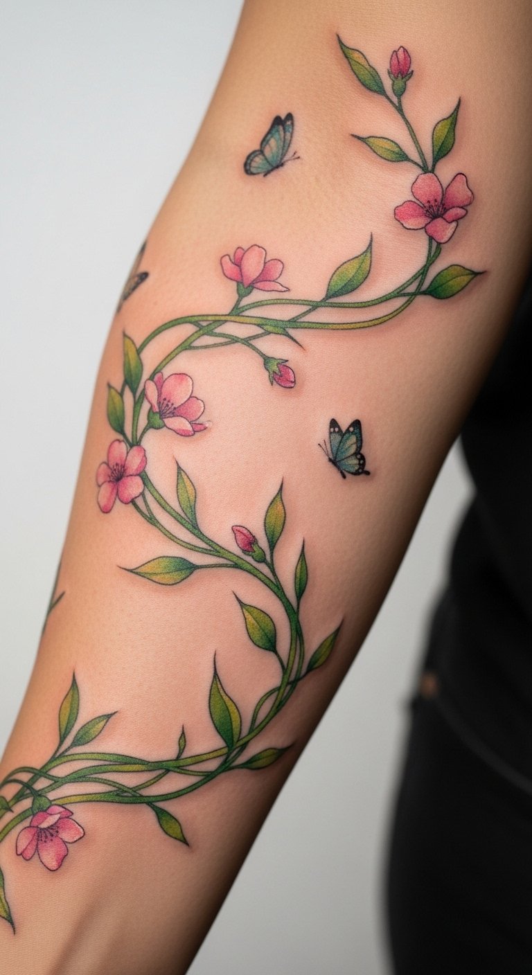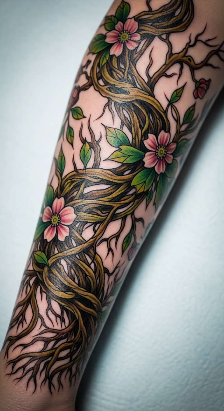 The vine and flowers together symbolize the journey of growth, reflecting how personal stories intertwine with broader cultural narratives. As the wearer experiences life changes, the tattoo transforms in meaning, embodying the beauty of evolution and artistic expression.