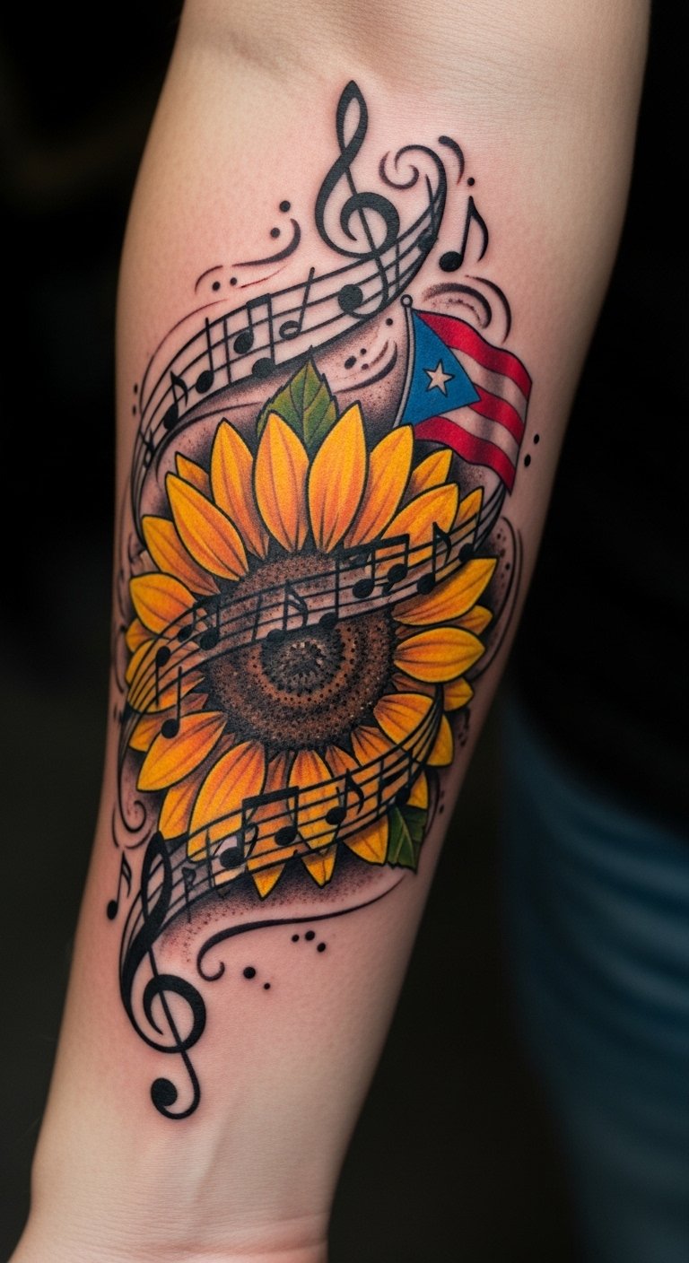 The musical notes represent the deep connection to music as a form of expression and freedom, while the Puerto Rican flag signifies pride in heritage.