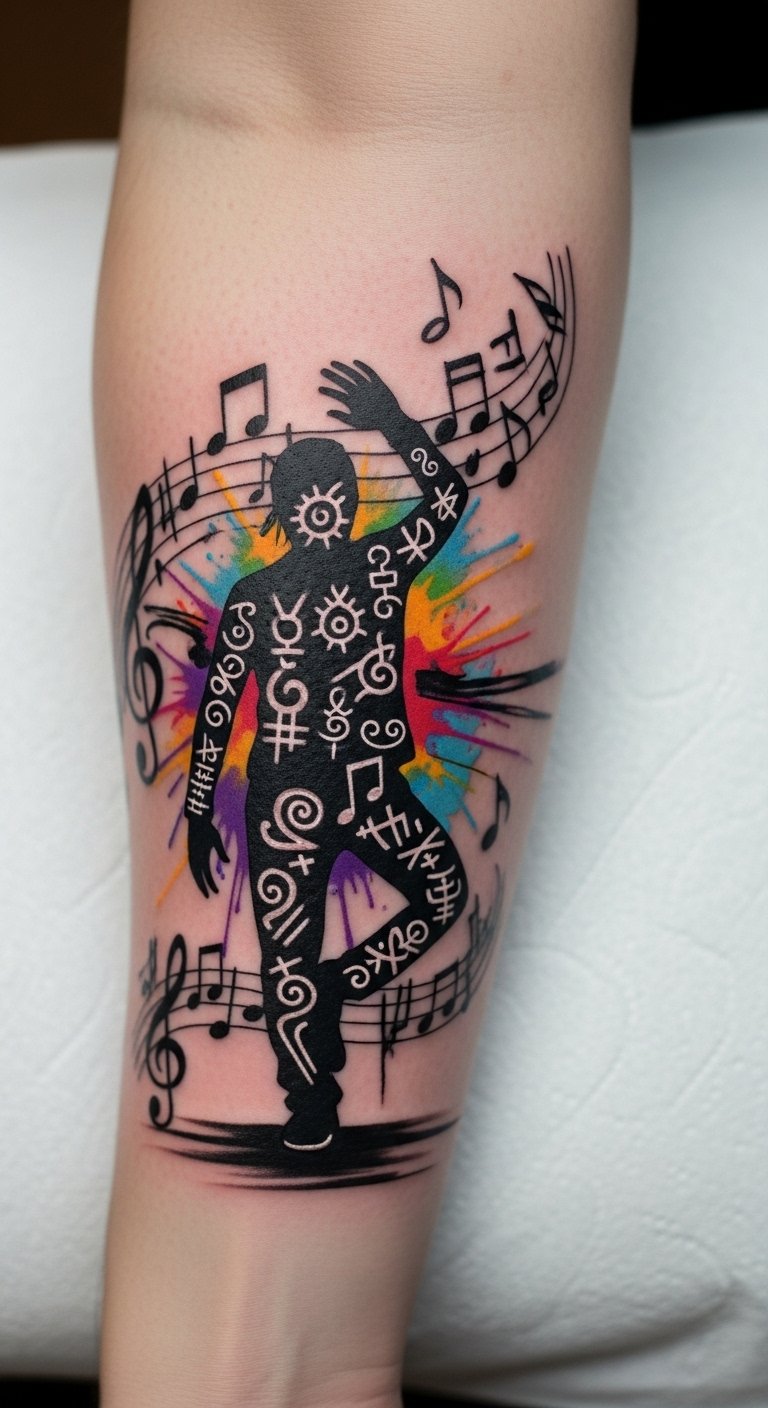 This tattoo symbolizes the powerful connection between music and visual art, celebrating cultural pride and personal expression.