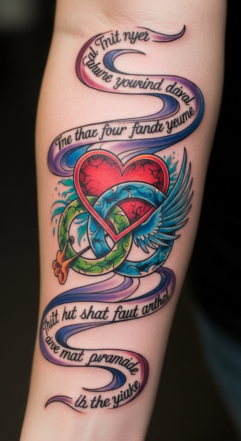 Positioned on the forearm, it serves as a constant reminder of the passions and experiences that shape one’s identity. The flowing lyrics add an emotional depth, connecting the art to significant life moments, making it a truly unique and unforgettable piece.