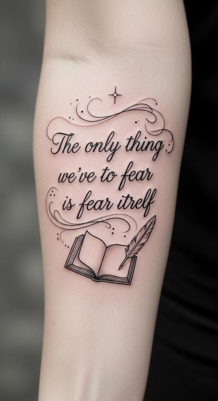 This tattoo symbolizes the courage to face life’s challenges, reminding the wearer that fear is often the greatest obstacle. Placed on the forearm, it serves as a visible mantra to inspire resilience in daily life. The choice of an open book and quill adds depth, celebrating the literary journey and the wisdom gained through experiences. The elegant design invites contemplation, making it not just a tattoo but a personal affirmation of strength and empowerment.