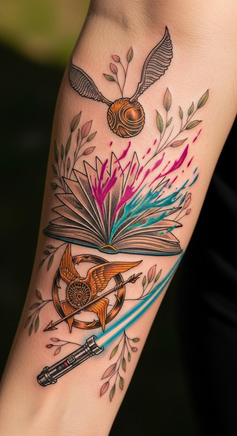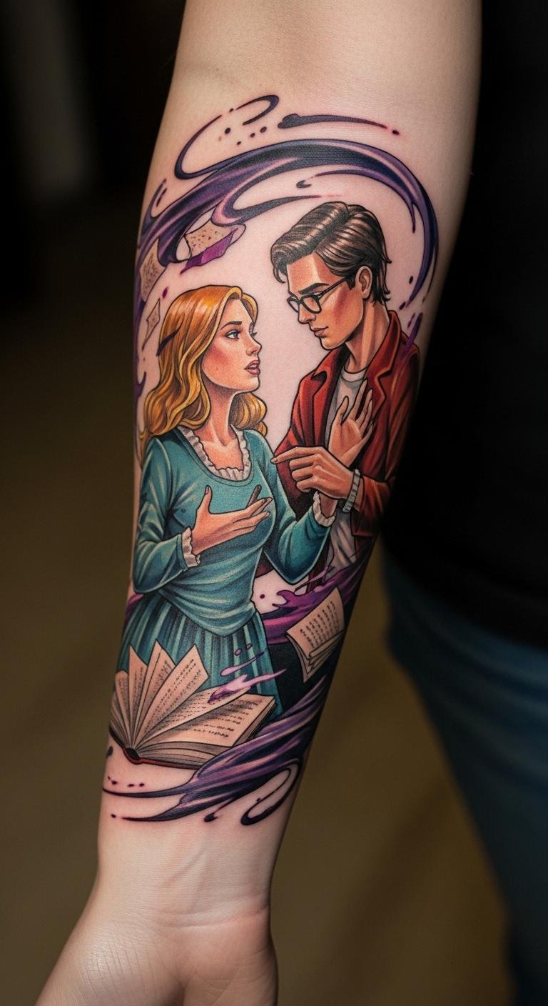 The dynamic interactions convey passion and creativity, inviting conversations and shared experiences with others. The choice of the forearm for placement allows for visibility, making it a constant reminder of the emotions and adventures found within the pages of cherished books, celebrating the magic of literature and its lasting impact.