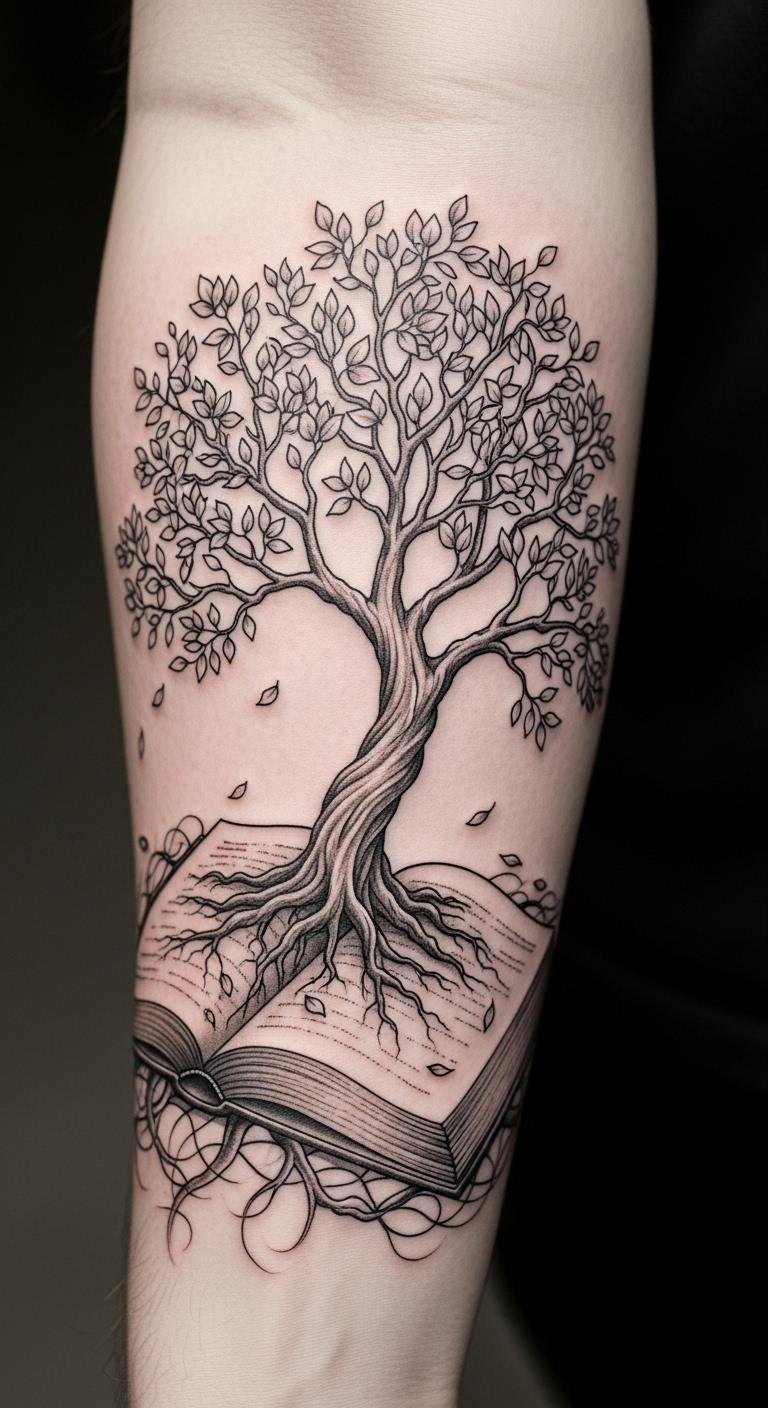This tattoo symbolizes the harmonious relationship between nature and literature, representing growth and the wisdom gained through reading.
