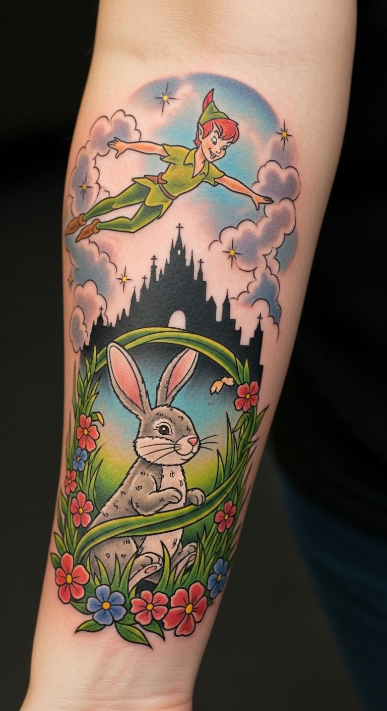 This tattoo design symbolizes the enduring magic of childhood stories and the adventures they inspire.