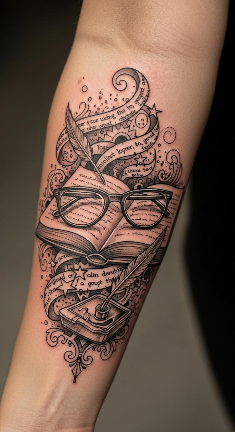 This tattoo embodies the essence of literary symbols, celebrating the journey of knowledge and the passion for storytelling.