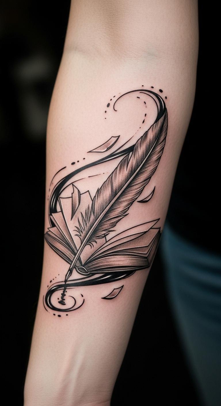 Placed on the forearm, it serves as a constant reminder of the exploration and enlightenment that literature offers. The quill represents the power of words, while the open book signifies the endless possibilities that come with each new story.