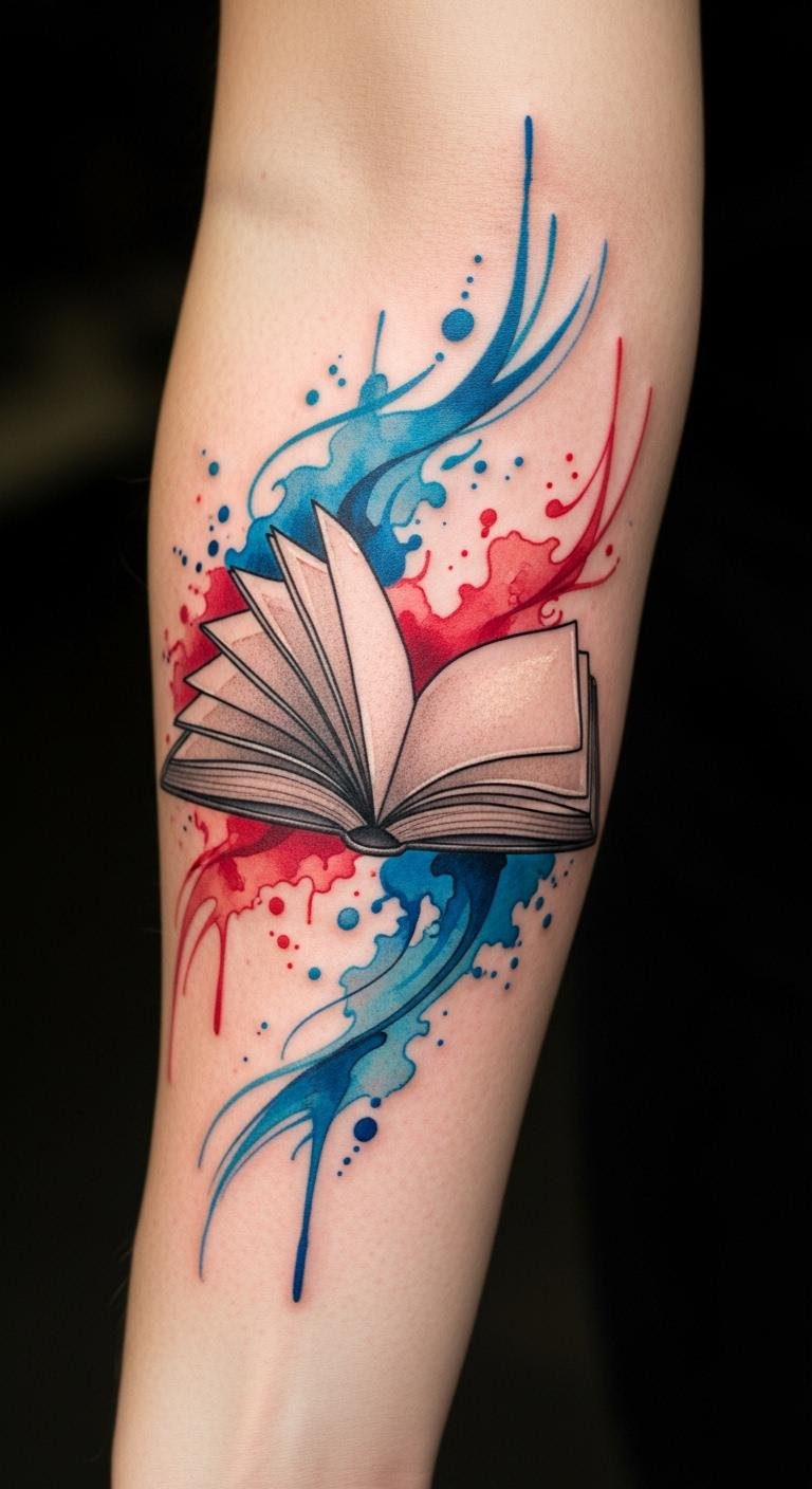 This enchanting tattoo symbolizes the freedom and creativity found in literature. The open book represents the stories that inspire and connect us, while the flowing watercolor splashes embody the fluidity of imagination.