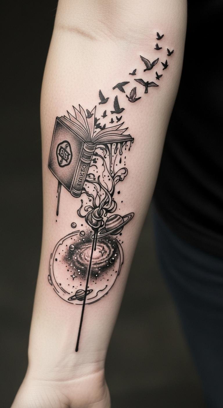 This tattoo embodies the enchanting connection between literature and the cosmos, symbolizing the limitless adventures found within books.