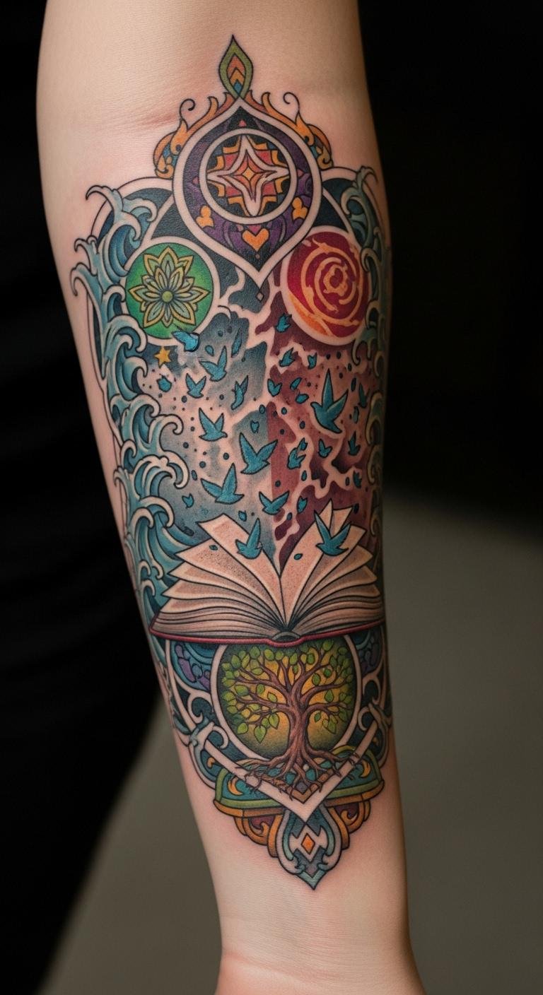 This tattoo design symbolizes the interconnectedness of global literature and the stories that transcend cultural boundaries.