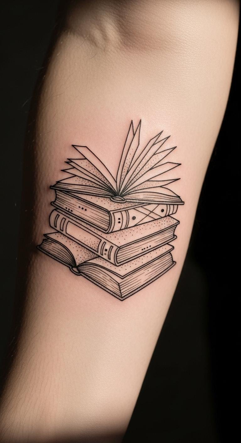 This tattoo symbolizes a deep appreciation for literature, portraying the journey of knowledge and imagination through the simplicity of book silhouettes.