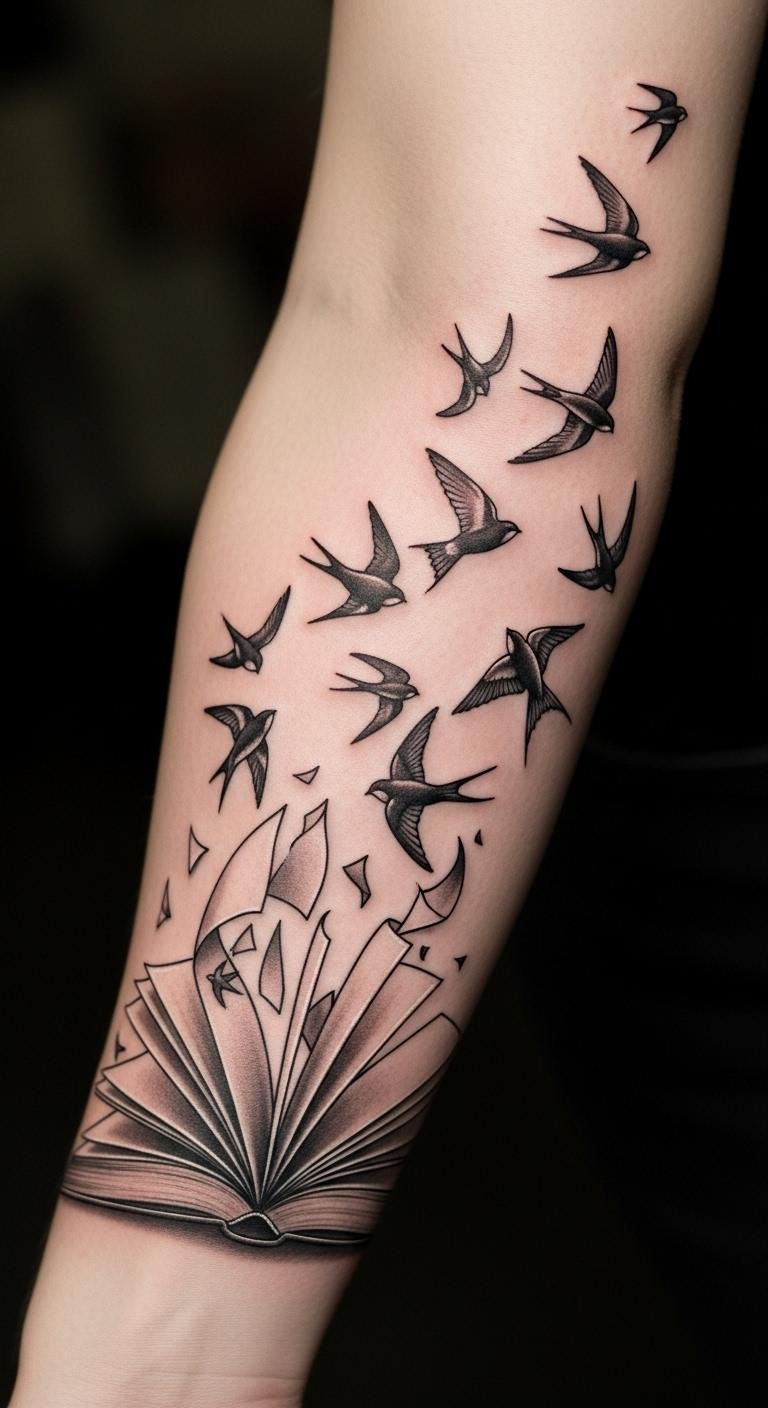 This tattoo symbolizes the journey of knowledge and the freedom that comes from embracing literature. The book represents wisdom and the stories that shape our lives, while the birds signify liberation and the ability to soar into new experiences.
