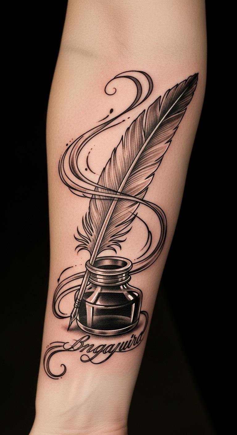 Positioned on the forearm, it serves as a constant reminder of the writer’s journey, visible to both the bearer and the world, inviting conversations about the power of words and imagination.