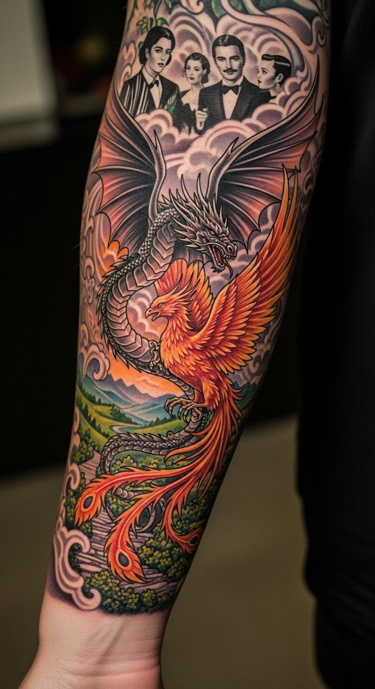This tattoo design embodies the essence of adventure and transformation, symbolizing the duality of strength and rebirth through the dragon and phoenix.