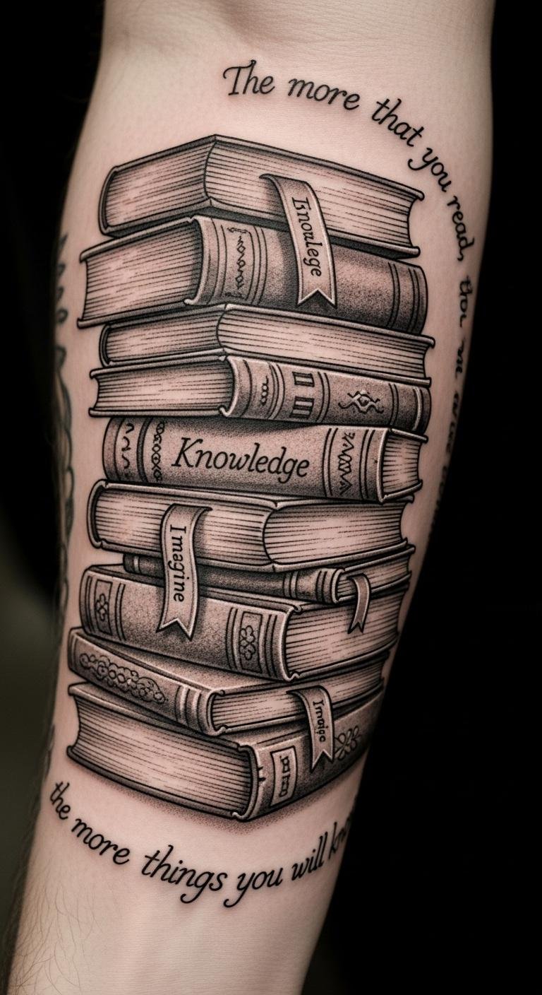 Placed on the forearm, the tattoo is easily visible, allowing the wearer to celebrate their literary journey with every gesture, inviting conversations about the tales that have shaped their lives.