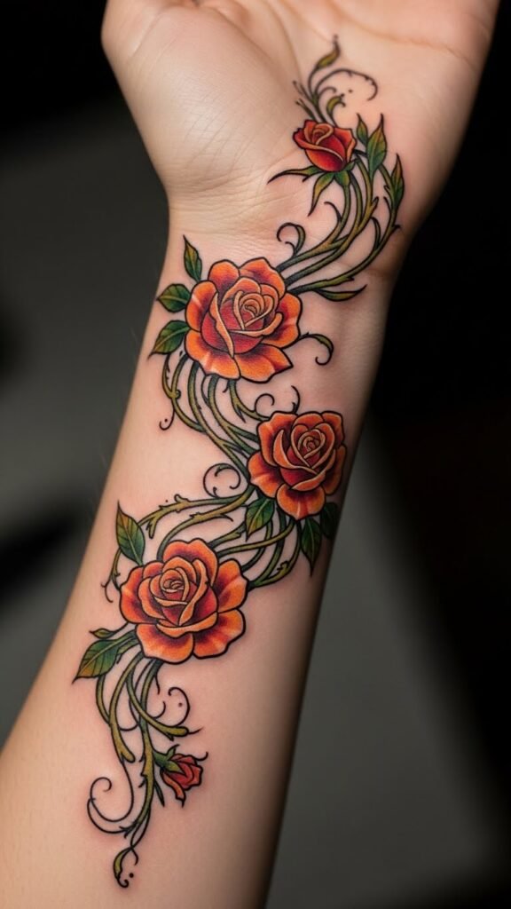 The tattoo symbolizes love and passion through the enchanting roses, while the flowing vines represent strength and connection.