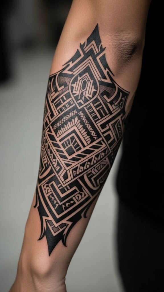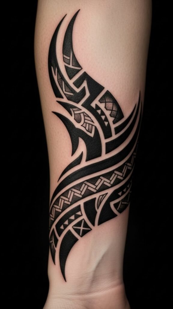 Placed on the forearm, it serves as a constant reminder of the wearer’s heritage and resilience. The intertwining lines reflect the journey of life, while the bold shapes emphasize confidence and individuality.