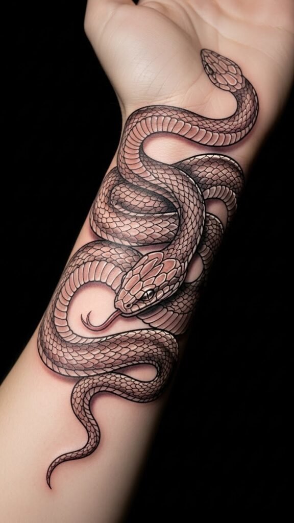 The snake, intertwined with leaves and flowers, reflects a free spirit and a love for the wild, embodying a journey of personal growth. Positioned on the forearm, it serves as a visible reminder of strength and resilience, inviting admiration and contemplation from onlookers while harmoniously blending with the body’s natural contours.