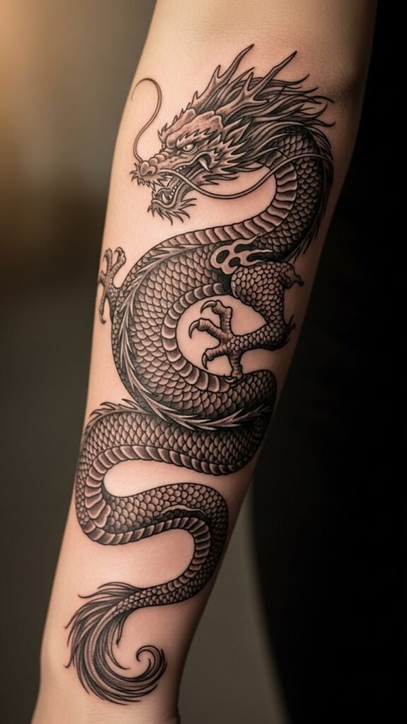 The dragon symbolizes wisdom and fierce independence, making this tattoo not just an adornment, but a powerful reminder of inner strength and freedom.