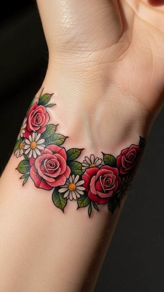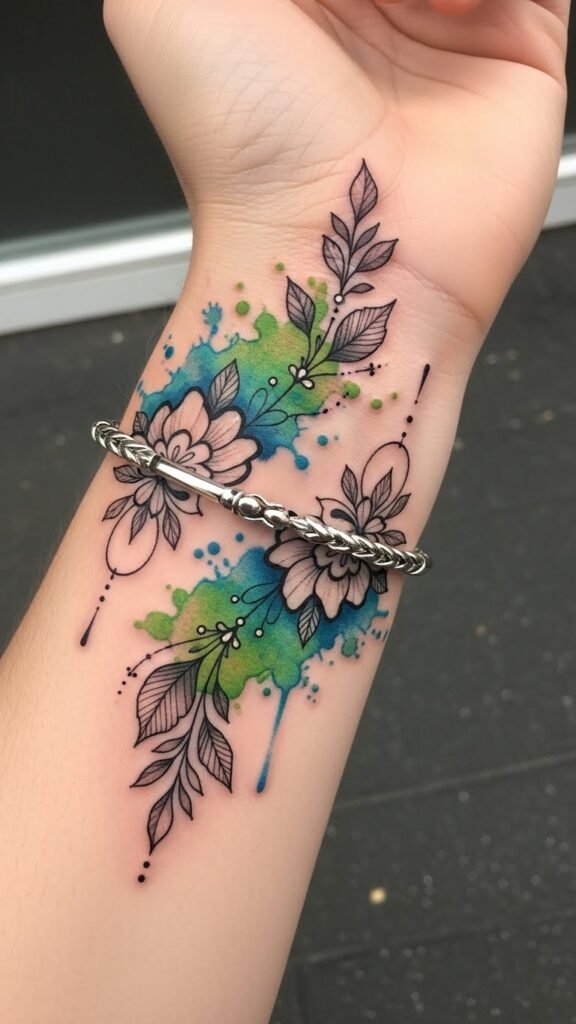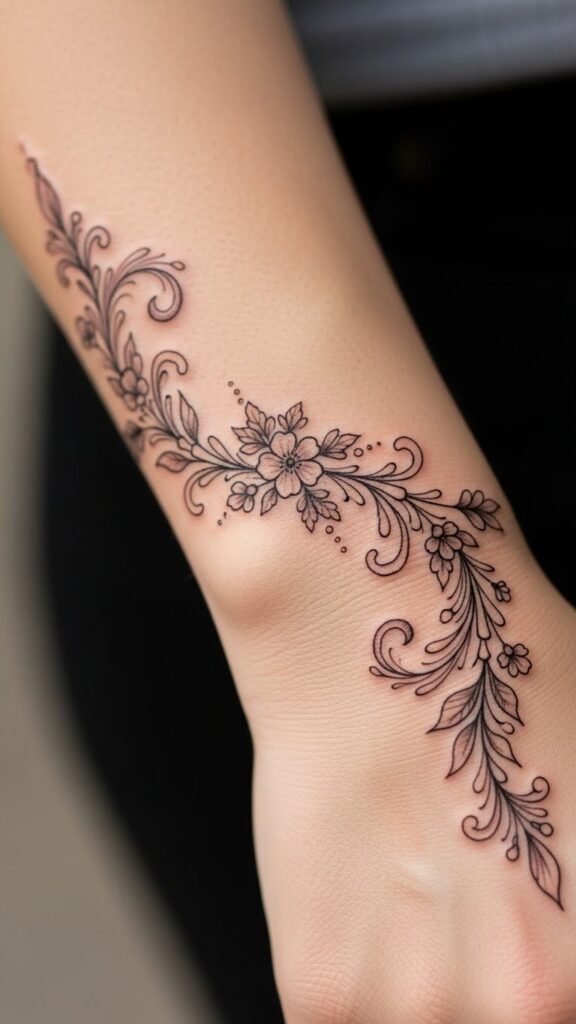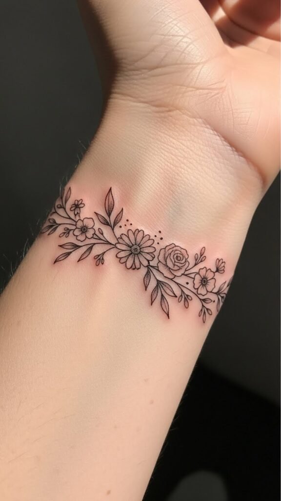 This stylish bracelet tattoo symbolizes beauty and growth, embodying the wearer’s personal journey and connection to nature.