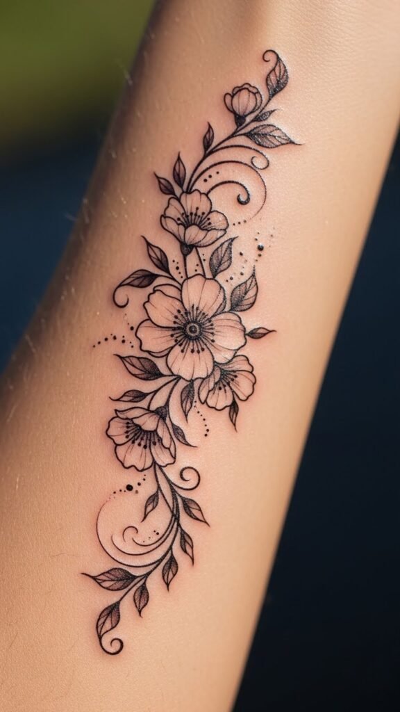 The floral elements represent resilience and the ability to bloom through life’s challenges, while the placement around the wrist draws attention to the flow of life and movement.
