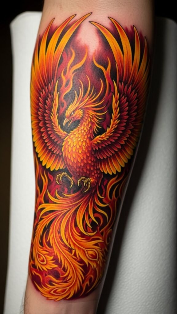 The vibrant colors of the phoenix illustrate strength and rebirth, while the rose reflects grace and evolution, celebrating the unique story of the individual.