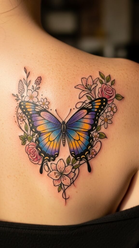The placement on the shoulder blade allows for both visibility and an elegant flow with the body’s curves, enhancing the natural beauty of the wearer. The colorful flowers complement the butterfly, signifying resilience and the blossoming of one’s true self.