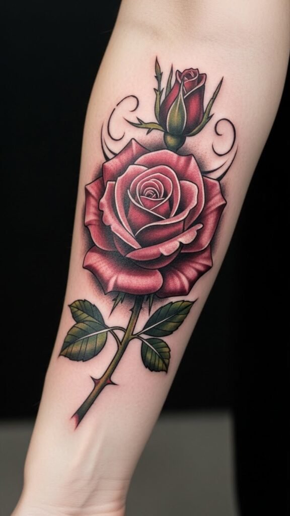 This elegant rose tattoo on the forearm not only serves as a striking piece of art but also embodies powerful symbolism—representing love, passion, and the strength to overcome adversity.
