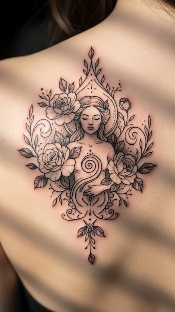 This tattoo beautifully embodies the essence of sacred femininity and the celebration of strength and nurturing spirit.