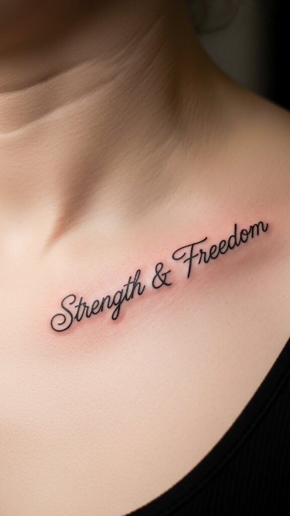 This placement on the collarbone highlights the tattoo’s intimate and personal nature, making it a visible reminder of resilience and empowerment.