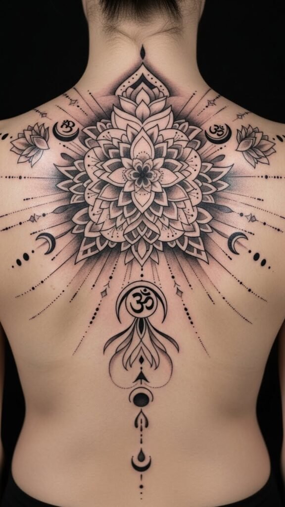 This mandala tattoo on the upper back embodies wholeness and balance, symbolizing the journey of self-discovery and empowerment.