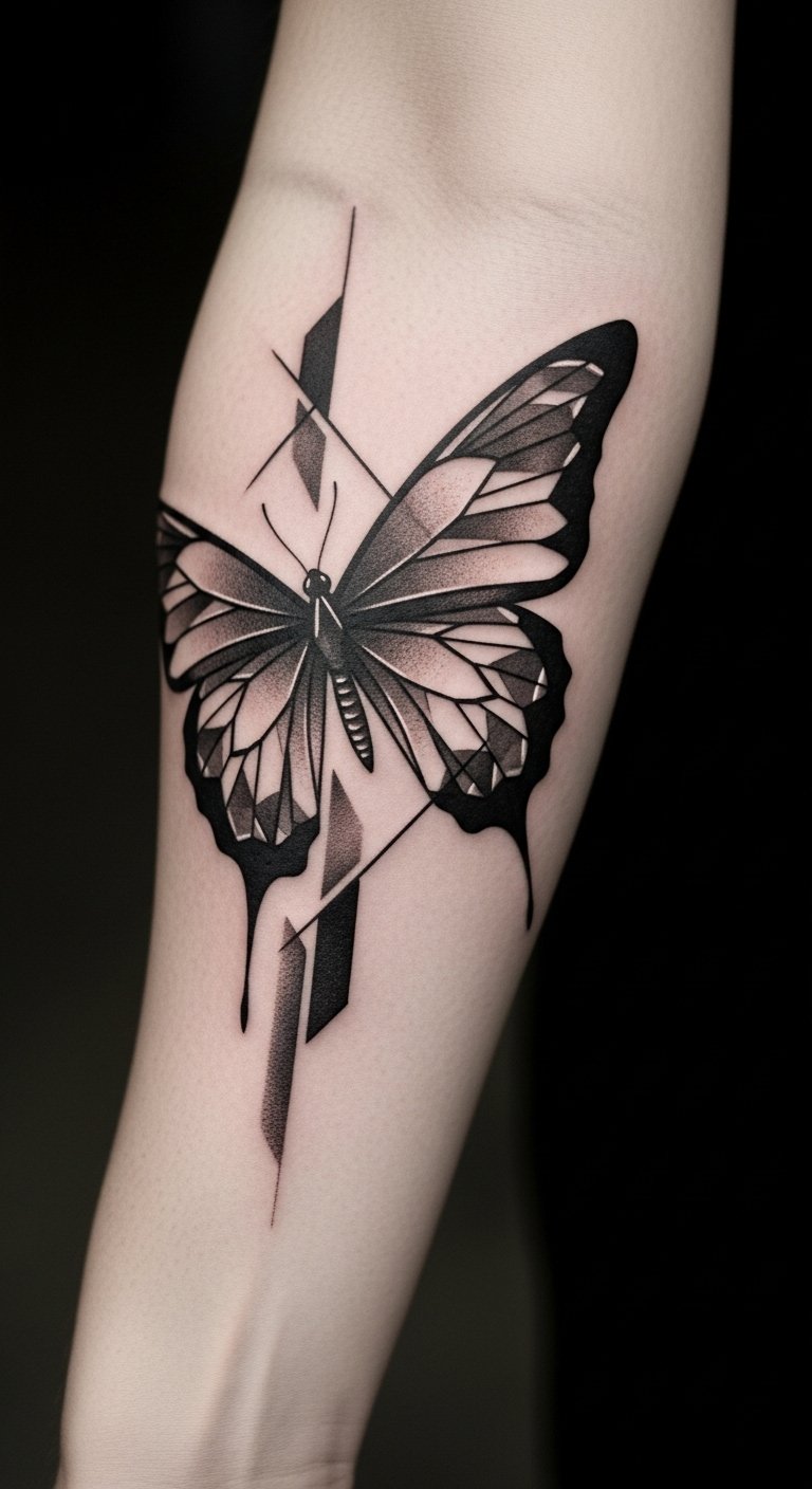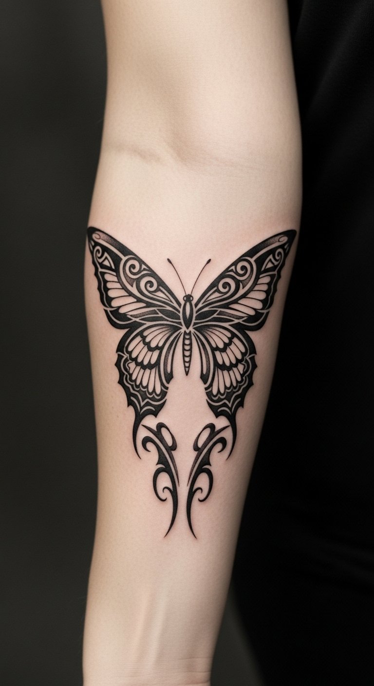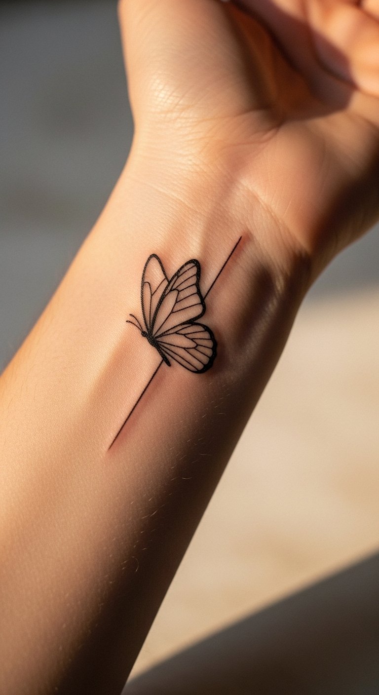 The butterfly tattoo on the inner forearm symbolizes feminine strength and resilience, serving as a constant reminder of one’s journey through transformation and growth.