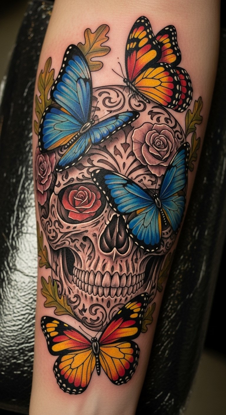 The tattoo elegantly merges the themes of mortality and rebirth, with the skull representing life’s impermanence and the butterflies symbolizing personal growth and freedom.