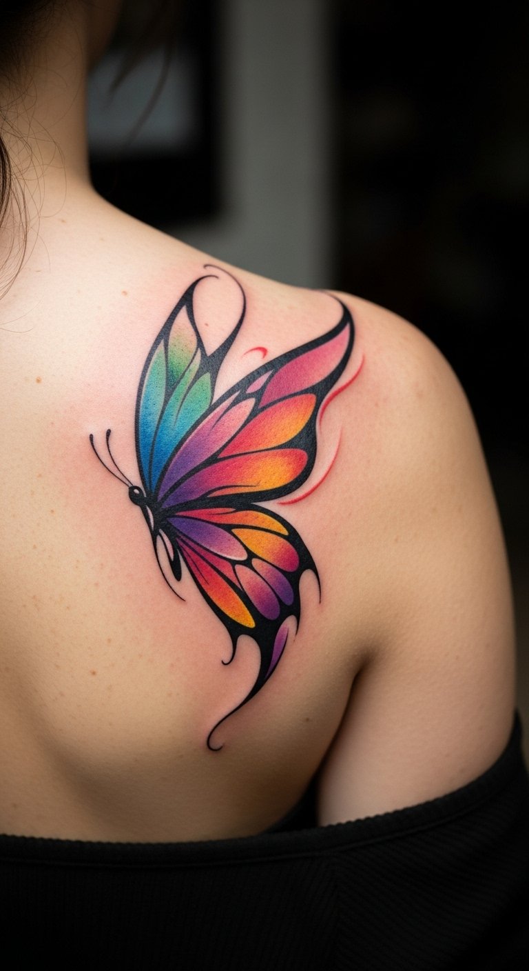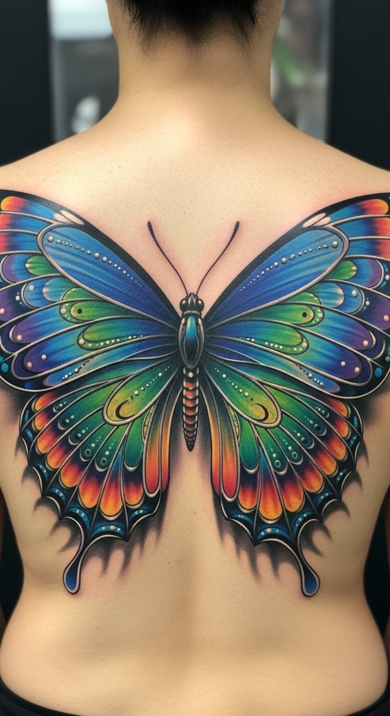 This butterfly tattoo symbolizes transformation, growth, and resilience, mirroring the journey of personal evolution. Placed on the upper back, it serves as a reminder of inner strength, visible yet intimate. The vibrant colors and intricate design evoke emotions of freedom and beauty, making it a perfect expression of individuality. This placement allows for versatility in showing or concealing the tattoo, aligning with the wearer’s mood and style.