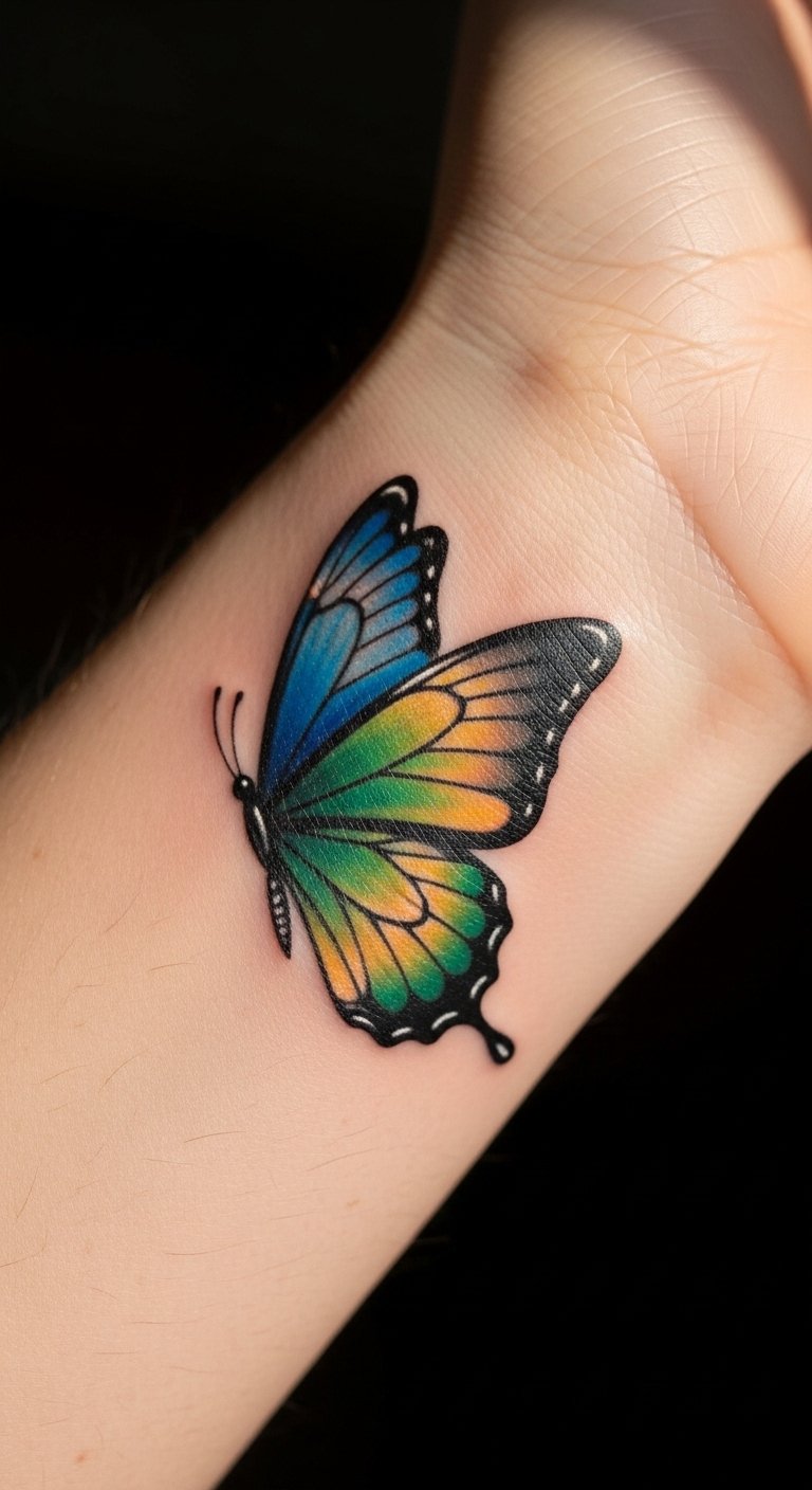 This small wrist butterfly tattoo serves as a profound symbol of transformation and freedom, beautifully reflecting personal growth.