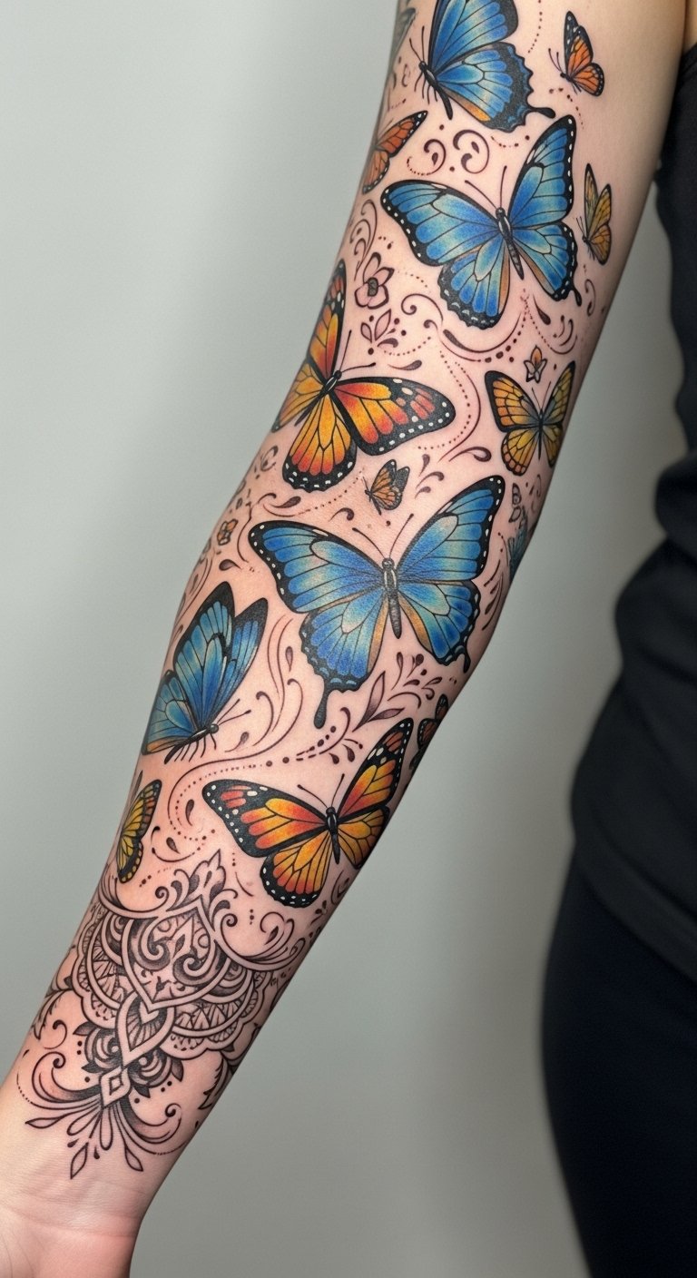 This tattoo design celebrates the essence of transformation and freedom, with each butterfly symbolizing personal growth and resilience.