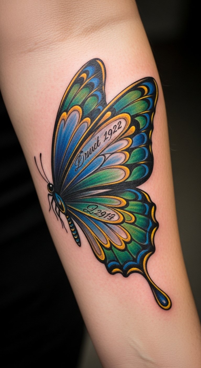 The butterfly tattoo on the forearm serves as a beautiful reminder of significant life moments, with each date representing a unique chapter in one’s journey.