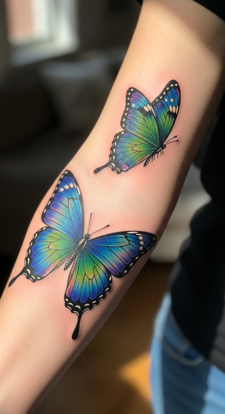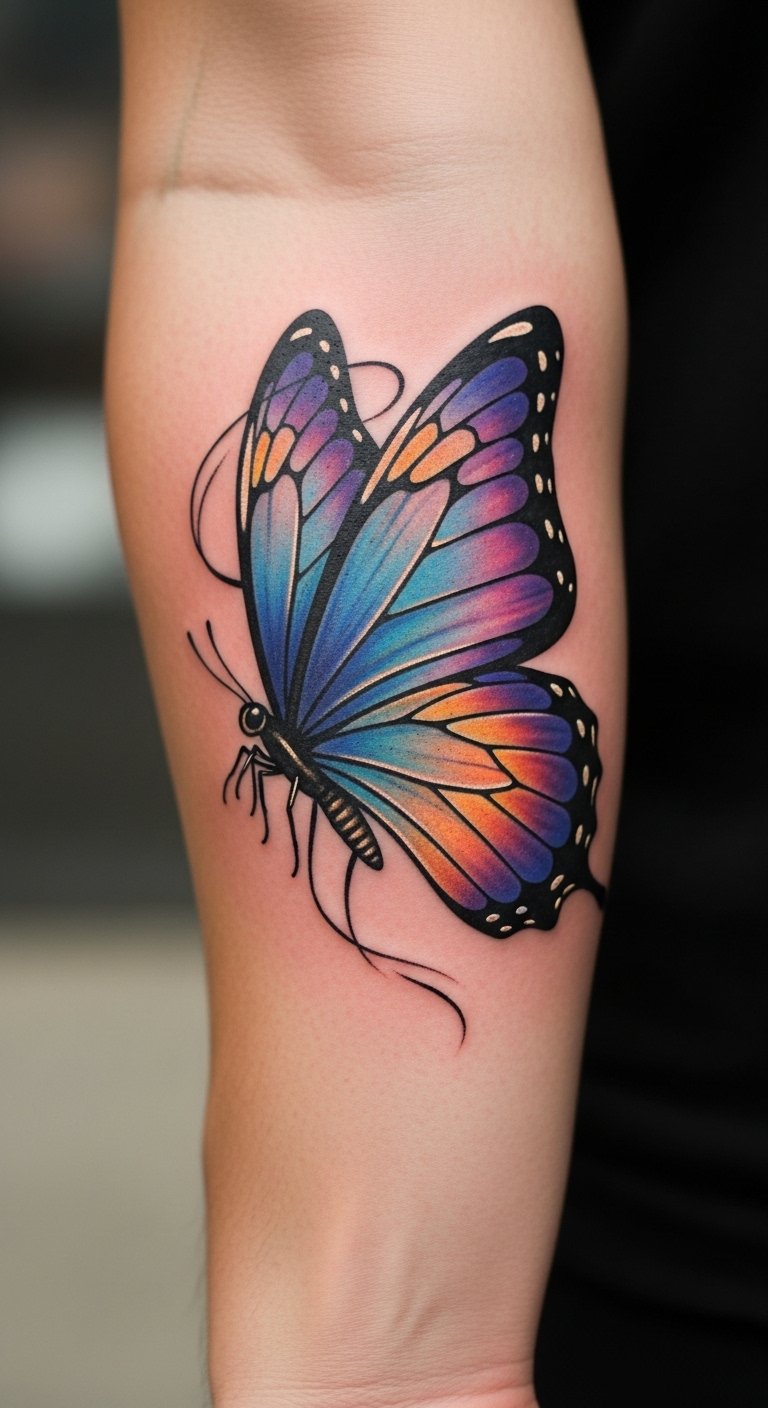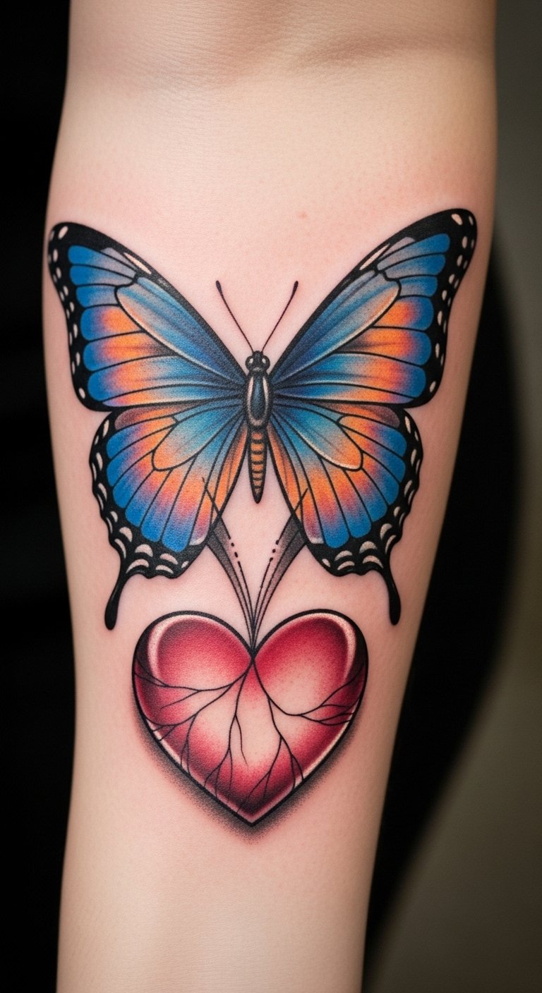 Positioned on the inner forearm, it serves as a daily reminder of the freedom and renewal that love brings. The vivid colors of the butterfly symbolize joy and metamorphosis, while the heart reflects deep emotional connections.