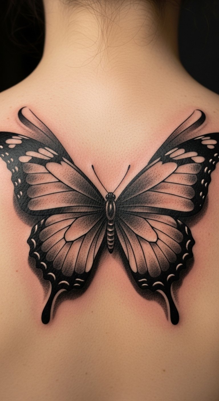 The butterfly, often associated with personal growth and self-discovery, carries deep symbolic meanings that resonate with one’s journey toward freedom. Its placement on the upper back allows for a sense of openness, inviting the wearer to embrace their story and share their experiences with the world.