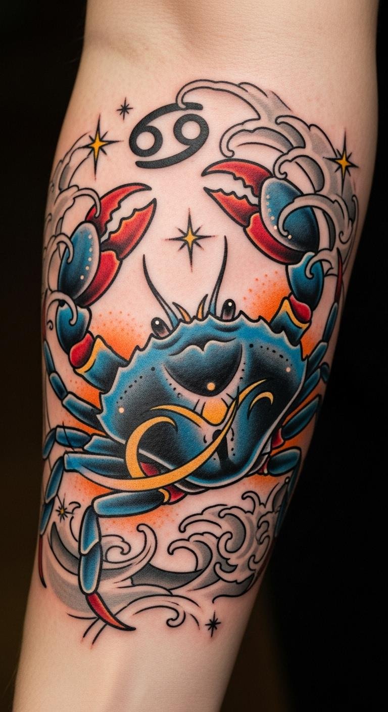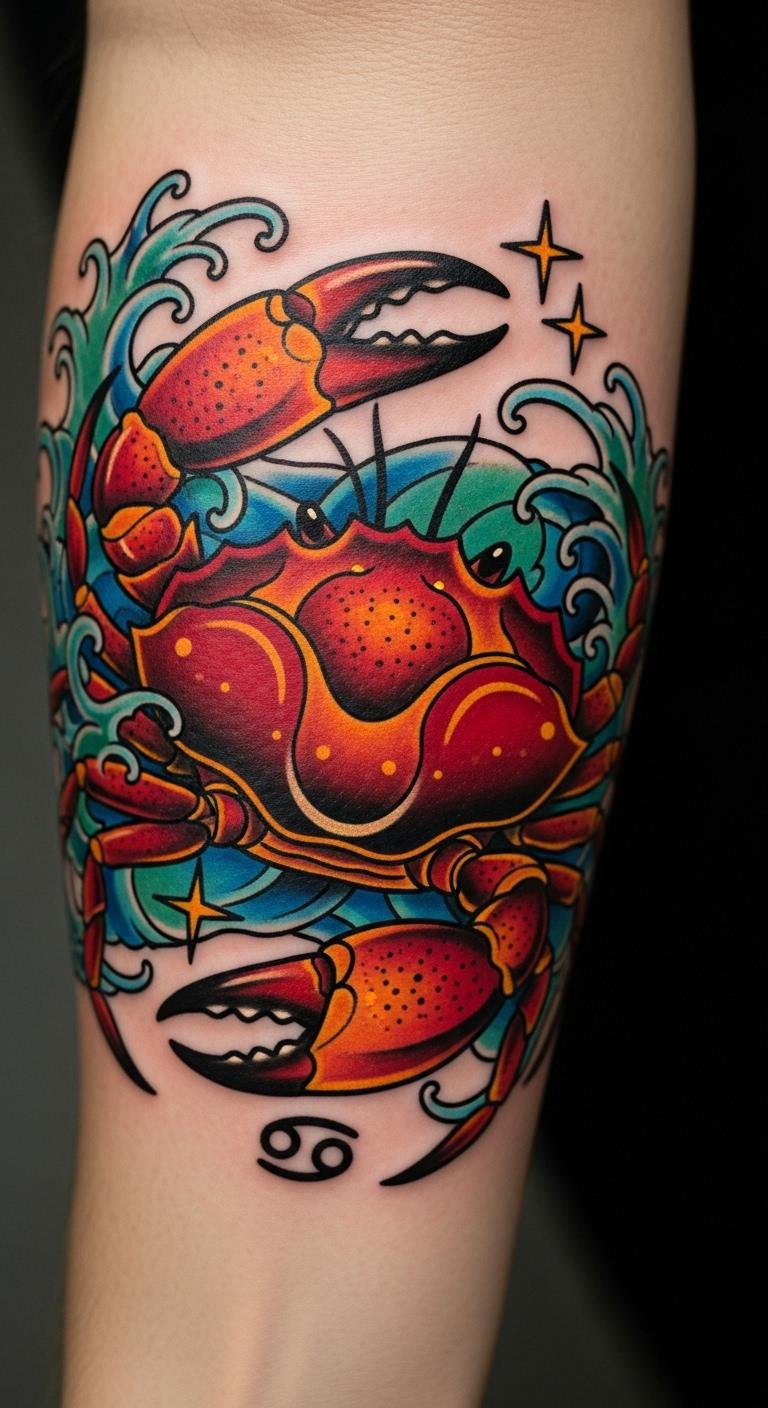 The bold colors not only enhance the tattoo’s emotional depth but also resonate with the wearer’s Cancer spirit, embodying warmth and strength.