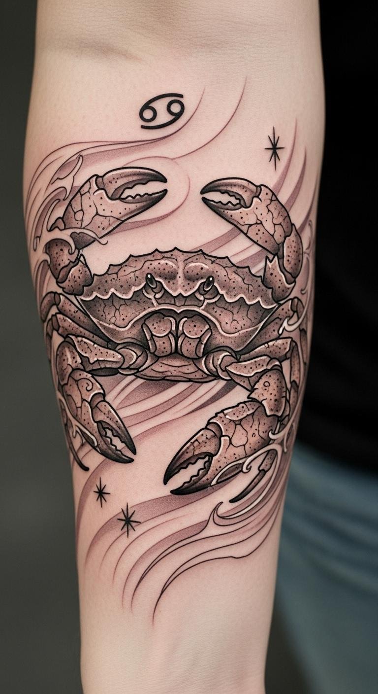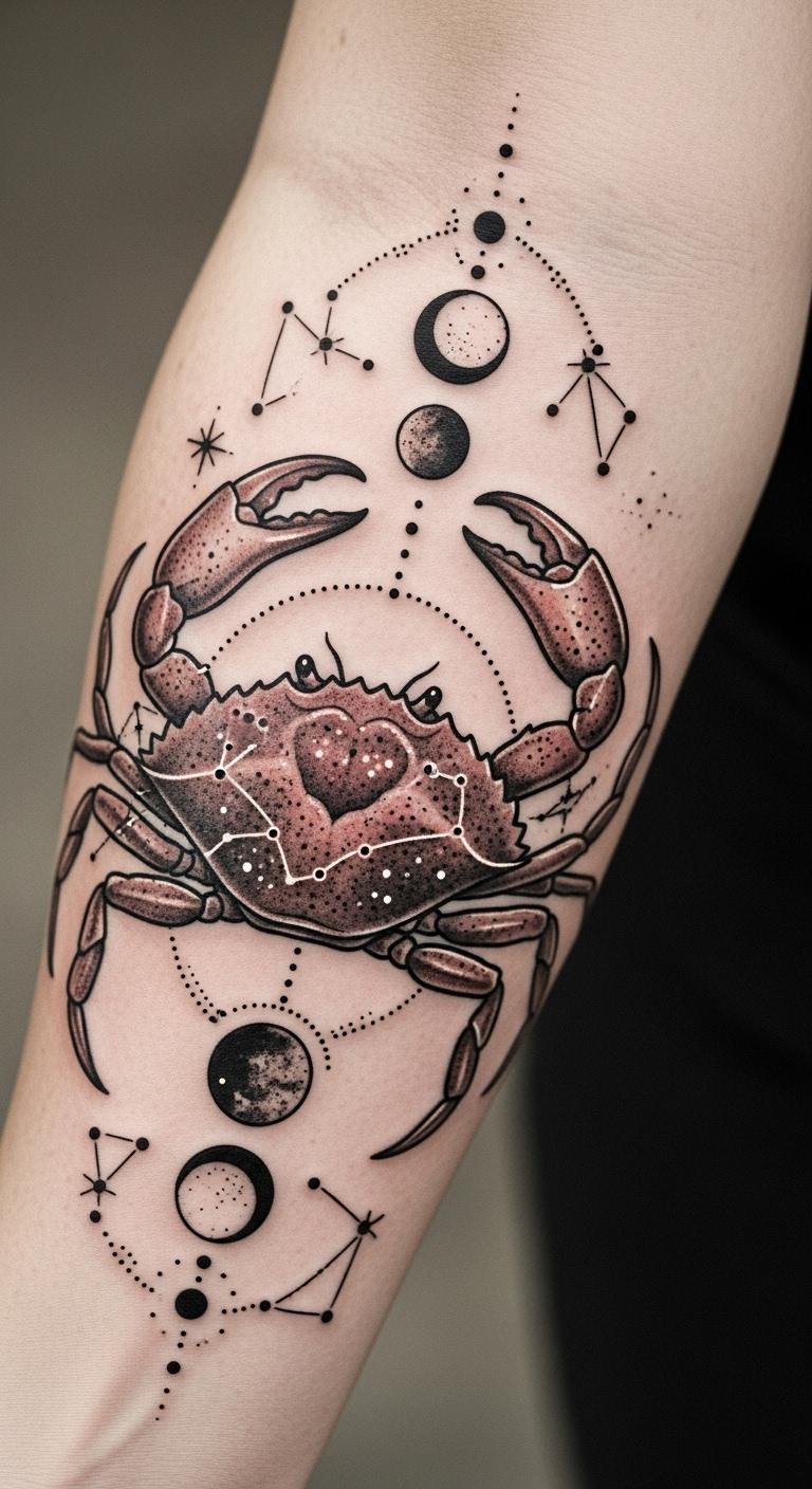This tattoo embodies the essence of Cancer, merging celestial elements with personal significance. The crab symbolizes protection and emotional depth, while the stars and lunar cycles represent guidance and intuition.