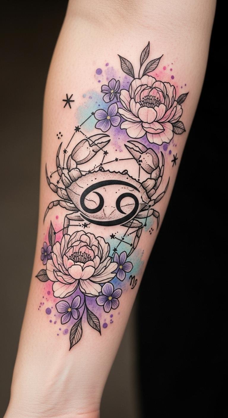 This tattoo design beautifully captures the essence of the Cancer zodiac, symbolizing emotional depth and nurturing spirit.