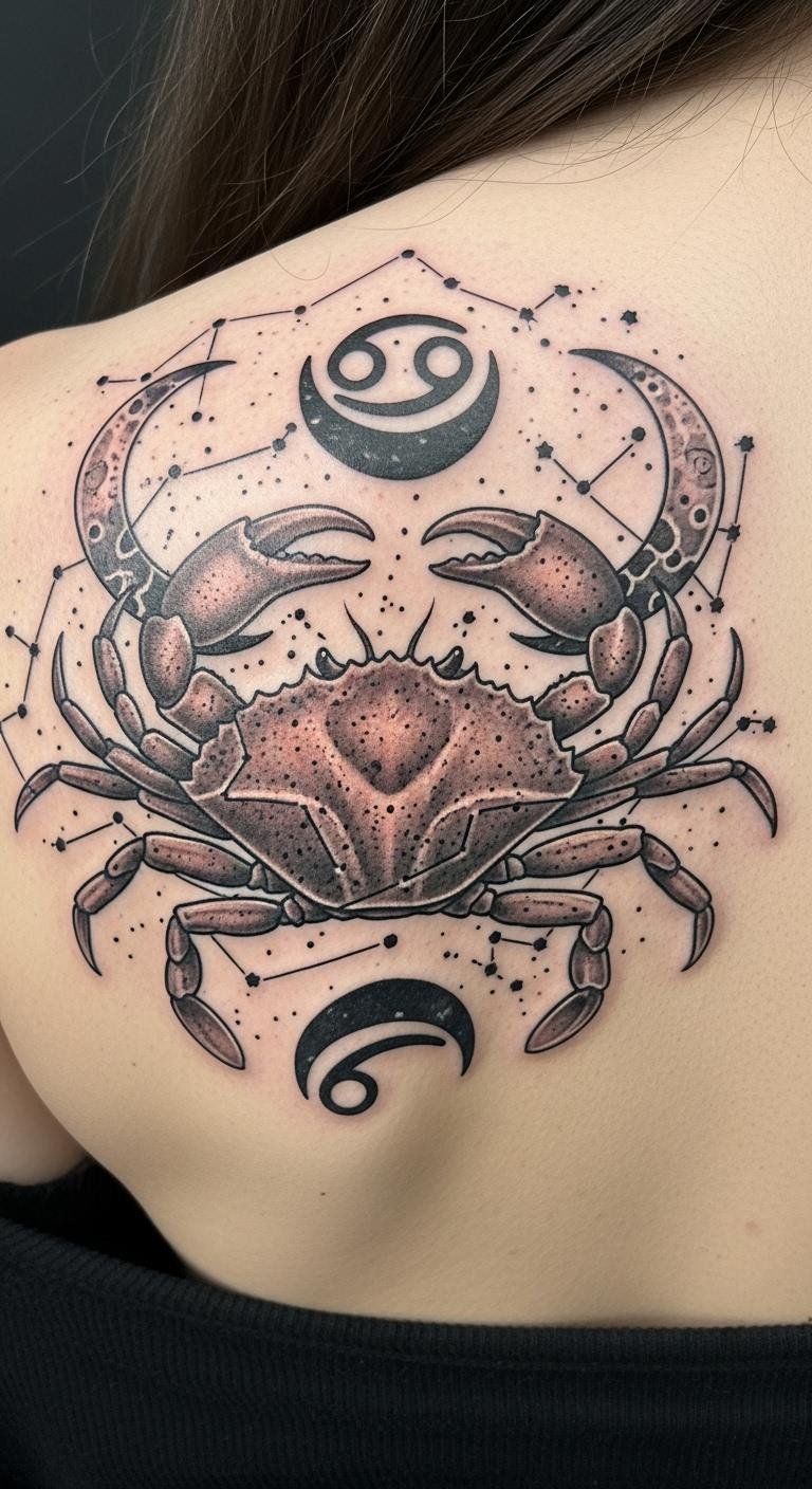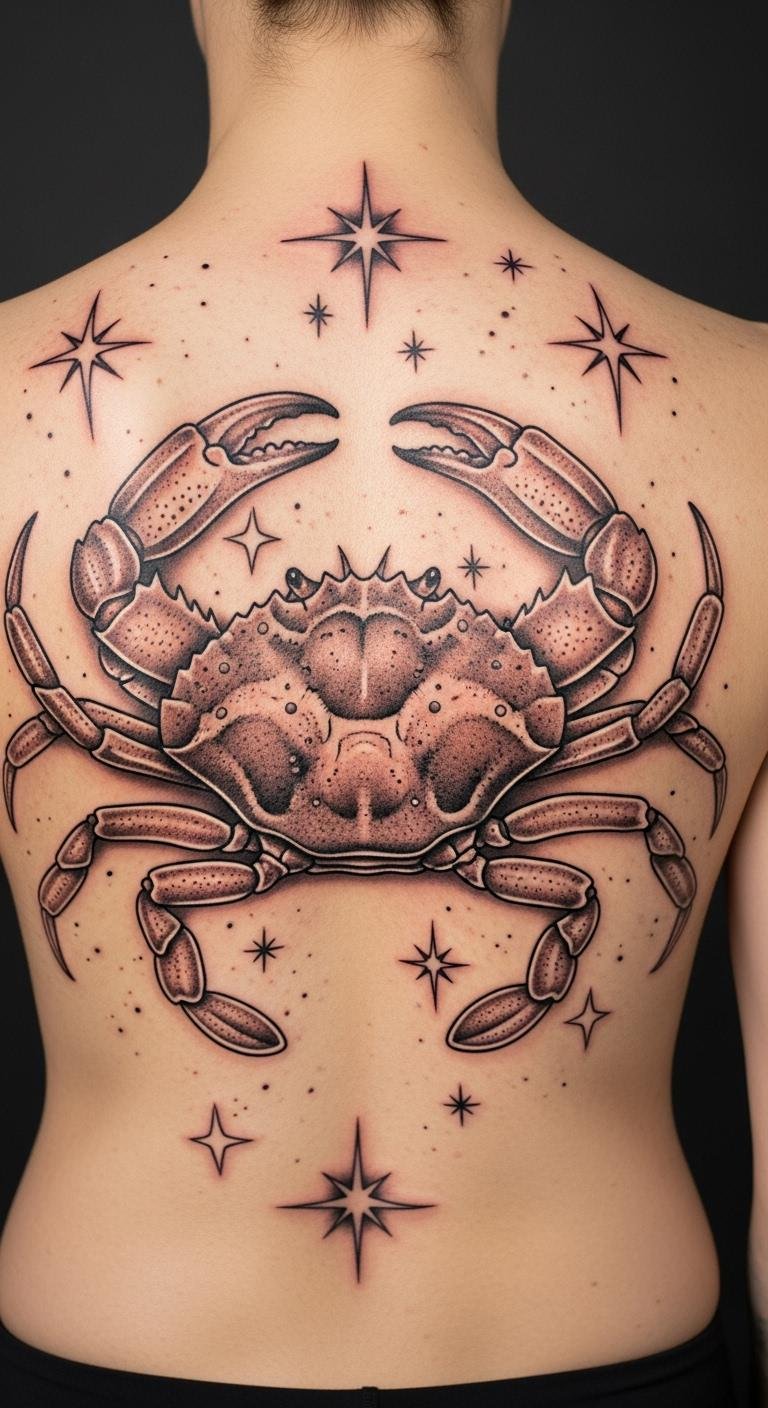 The crab symbolizes emotional depth and resilience, while the stars signify a sense of wonder and spirituality. Positioned on the upper back, it serves as a personal canvas that can be easily displayed or hidden, allowing for both individual expression and a connection to the universe’s embrace.