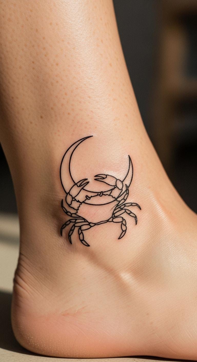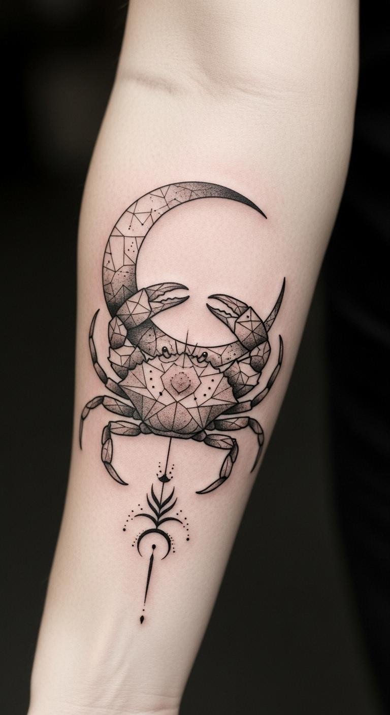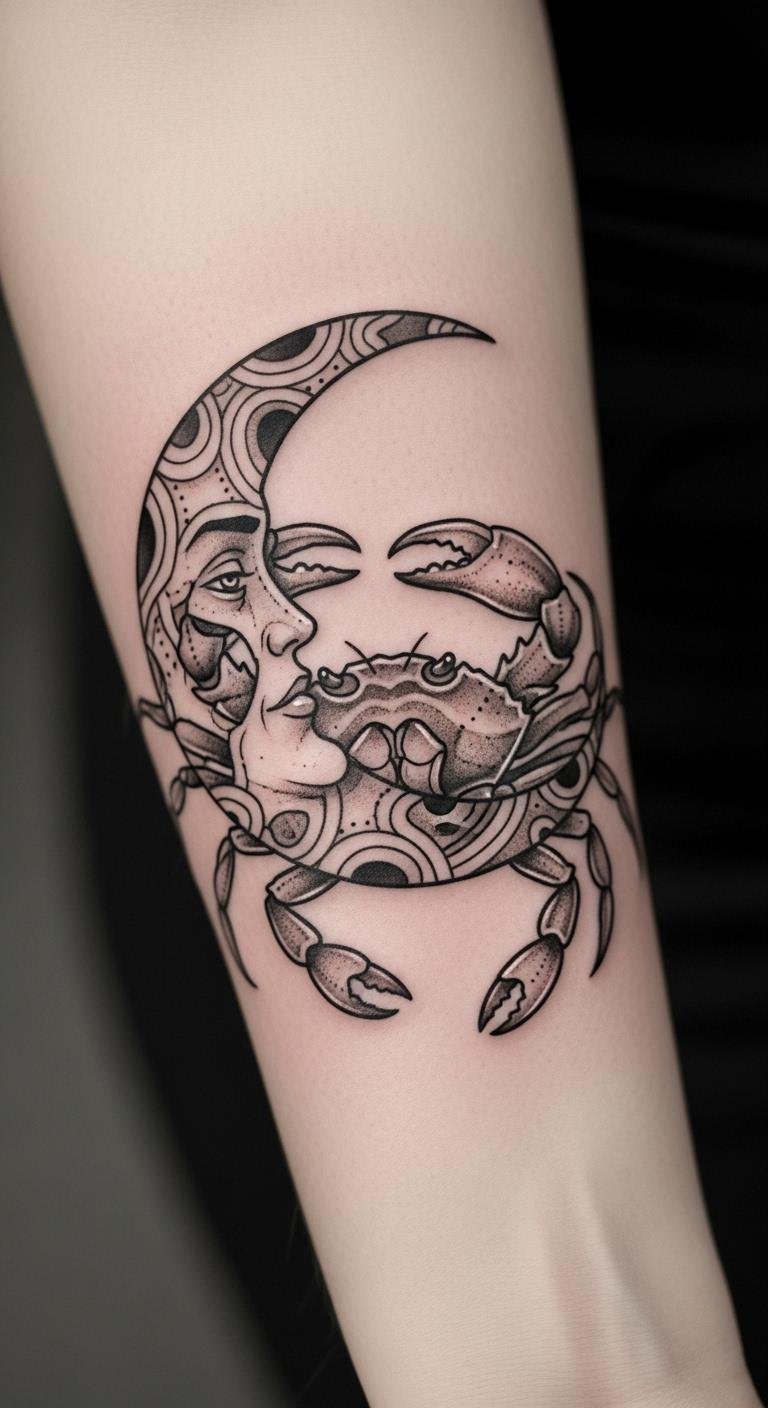 This tattoo design symbolizes the nurturing and sensitive nature of the Cancer zodiac, with the crab representing emotional depth and the crescent moon signifying intuition and femininity.