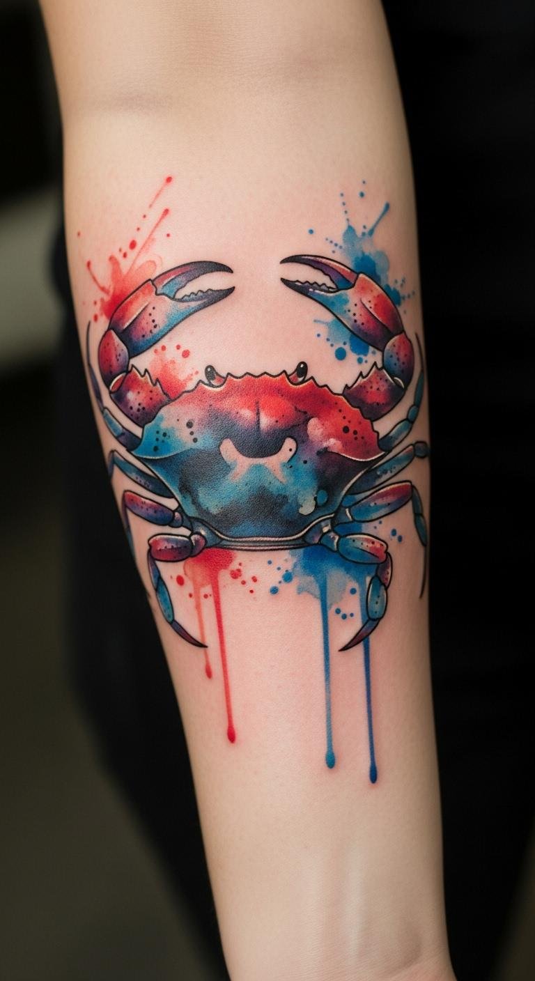 The watercolor crab tattoo symbolizes the emotional depth and nurturing spirit associated with the Cancer zodiac. The vibrant colors convey a sense of freedom and creativity, while the crab itself embodies themes of protection and loyalty, reflecting the wearer’s unique identity.