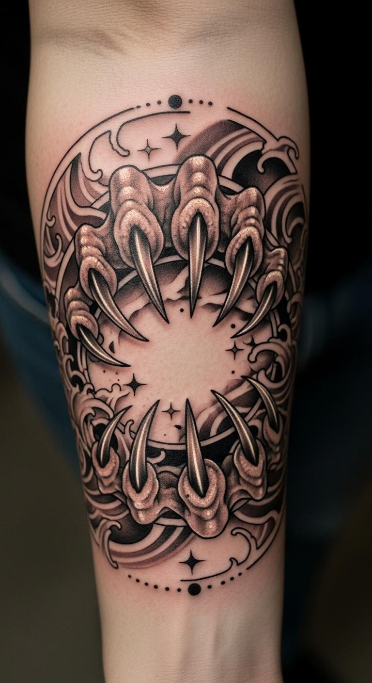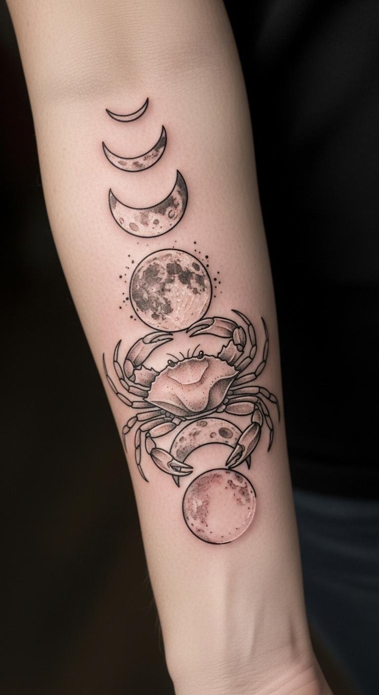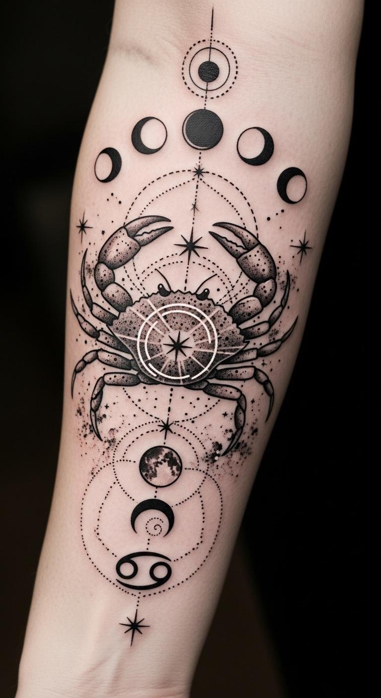 This tattoo design embodies the essence of Cancer, reflecting emotional cycles and the connection to lunar energy.